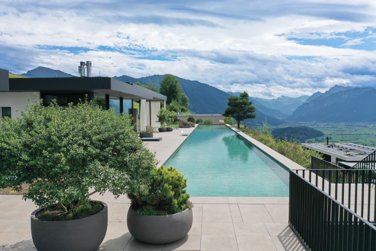 Herzstück der Anlage ist ein 50 × 5 Meter grosses Betonschwimmbad mit hochwertiger Plattenverkleidung. Die Linien sind ruhig, die Wirkung bewusst reduziert. Der integrierte Hubboden macht den Pool flexibel nutzbar — für Sport, Erholung oder Events. Funktionalität, ohne sichtbar zu werden.