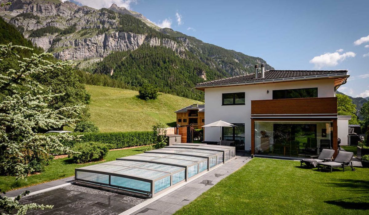 Unsere Schiebeüberdachung besteht aus robustem, beschichtetem Aluminium mit abgerundeten Profilen und laufruhigen Rollen— ganz easy zu öffnen und zu schliessen Sie bildet eine stabile Barriere, die ungebetene Gäste zuverlässig davon abhält, ins Wasser oder gar in eine Notlage zu geraten.